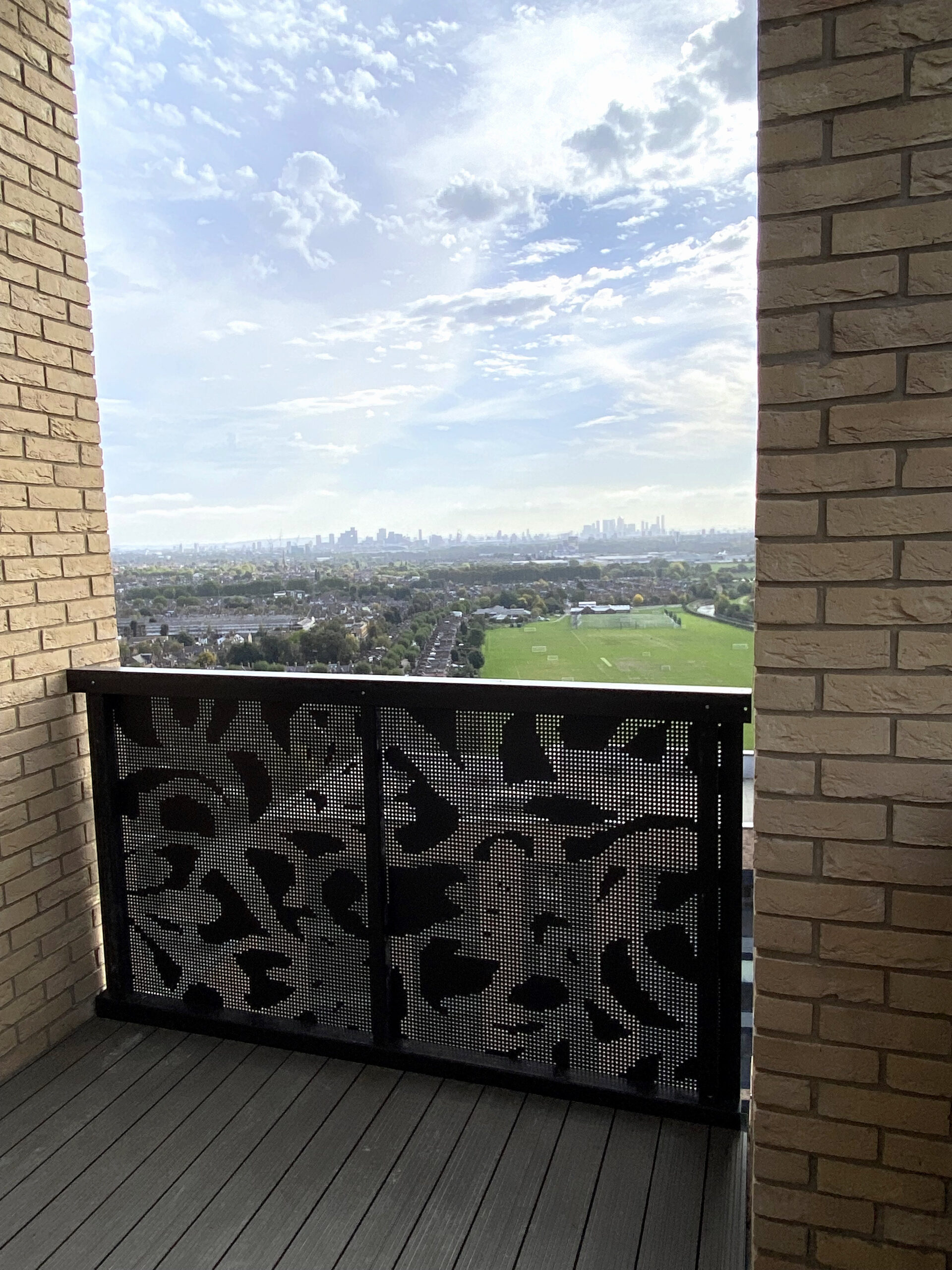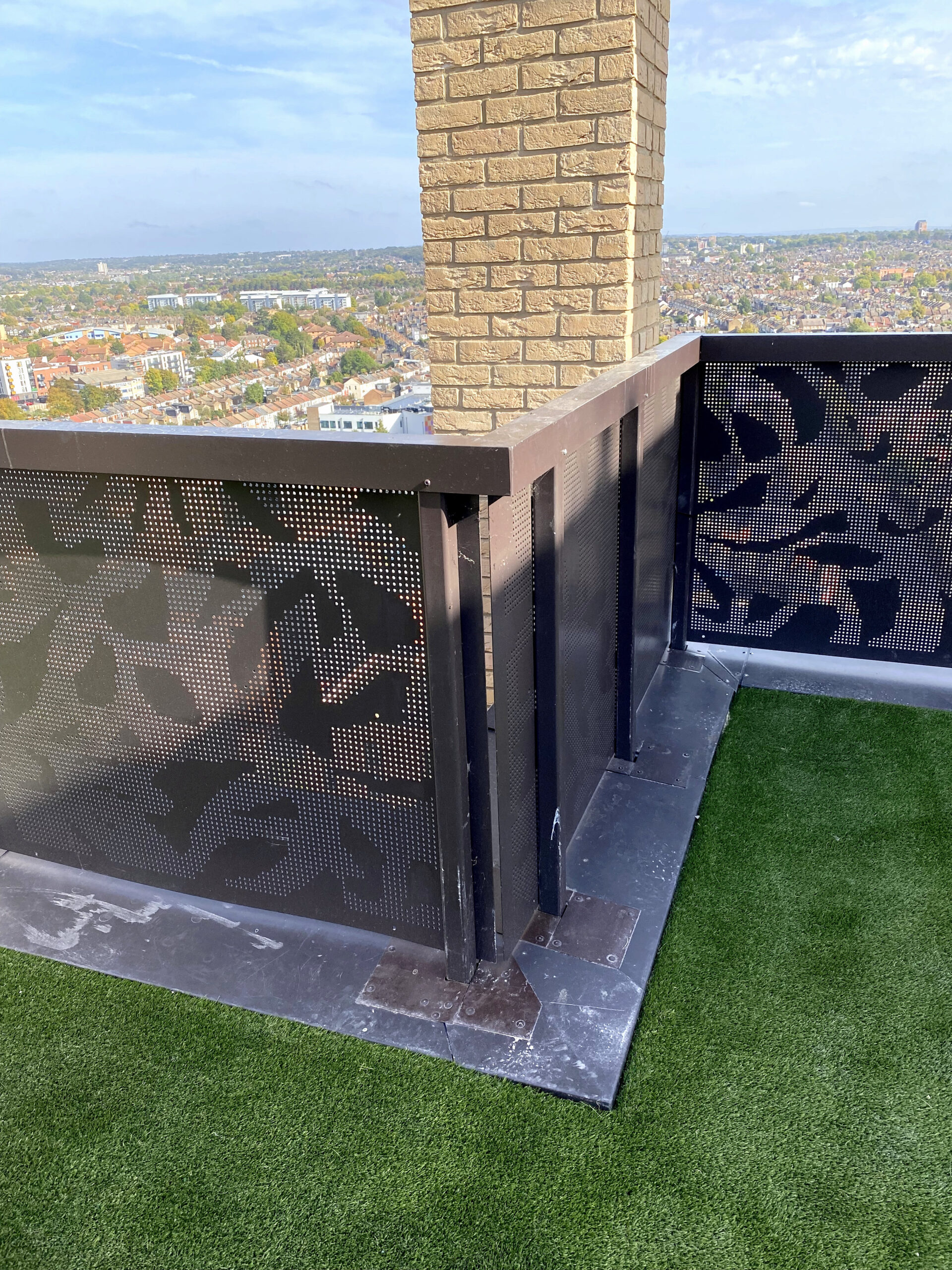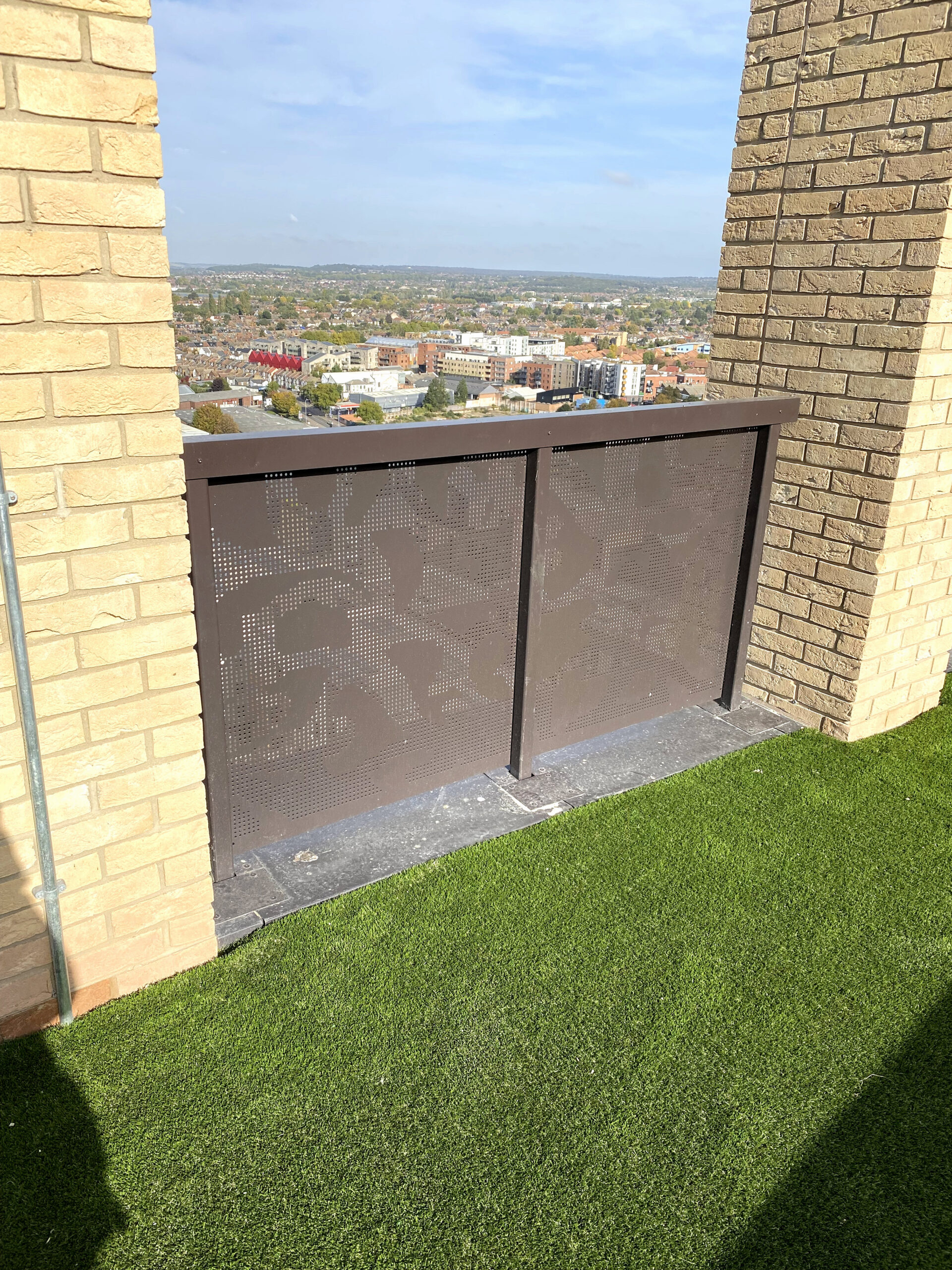 Each balcony was crafted with precision, featuring clean welded lines, sharp detailing, and a contemporary slatted balustrade design that adds depth and rhythm to the building’s exterior. In addition to the balconies, Wiltech also designed and installed bespoke terrace balustrades featuring laser-cut perforated panels with a unique patterned design, providing both privacy and visual interest to the rooftop spaces.