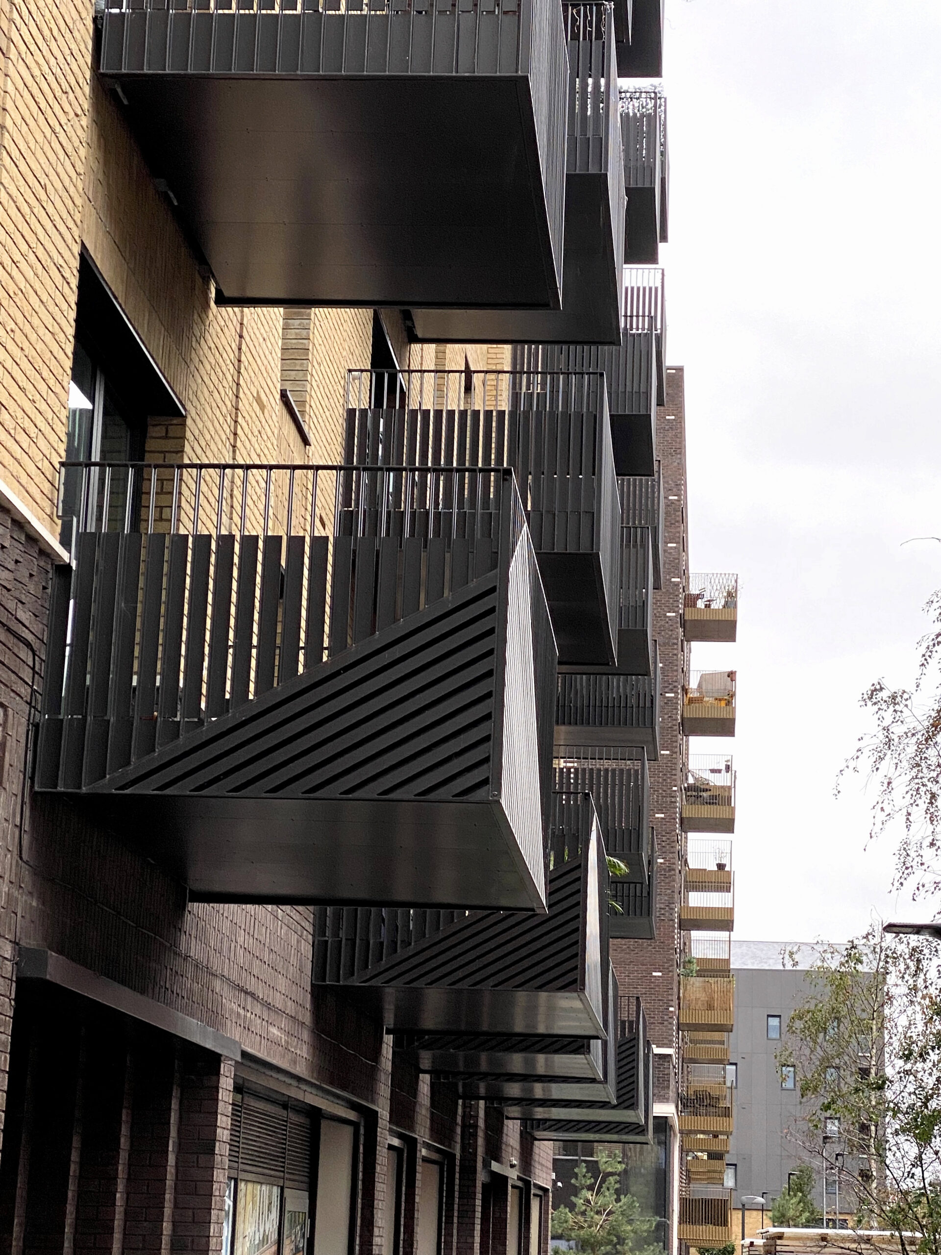 Wiltech Engineering delivered the full balcony and terrace balustrade package for Barratt Homes at the Blackhorse development in London E17. The project showcases a striking series of cantilevered balconies fabricated entirely from mild steel and finished in RAL 7016 Anthracite Grey, creating a strong architectural contrast against the light brick façade.